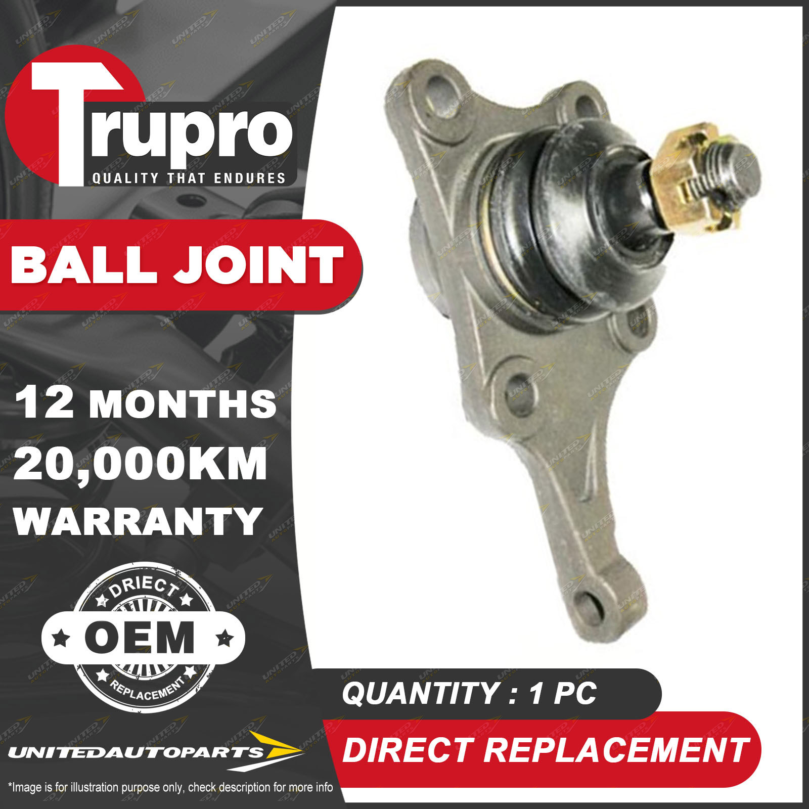 CONTENTS: 1 Pc Trupro RH Lower Ball Joint SUITS: TOYOTA TARAGO YR31 4WD YR31 4WD 11/82-12/89 (*please advise year model, so we can make sure send you the right parts) |