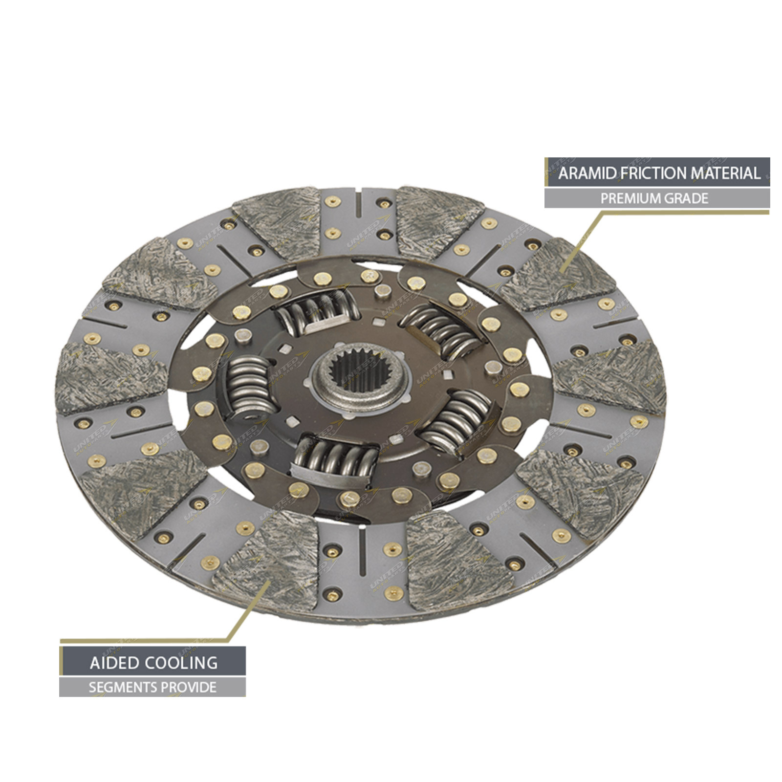 The kit's clutch disc has a unique flywheel side friction material. The Aramid friction material exhibits 50% less wear than a conventional clutch disc's friction material. This material also reduces the effects of clutch fade. Fade is the decline in the clutch system's ability to transmit torque as operating temperatures increase.