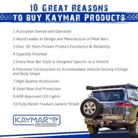For more than 30 years , Kaymar has been designing and manufacturing rear bars and carriers for outback travellers throughout Australia and across the world. Their bars have been proven and tested in the harsh Australian environment , and is the preferred choice for long range and 4WD enthusiasts. |