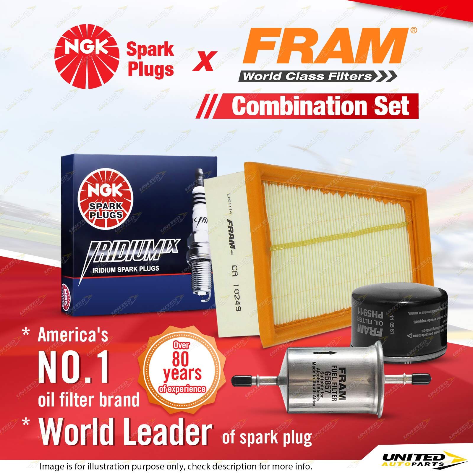 Contents : NGK Iridium IX Spark Plugs + Fram Filter Service Kit