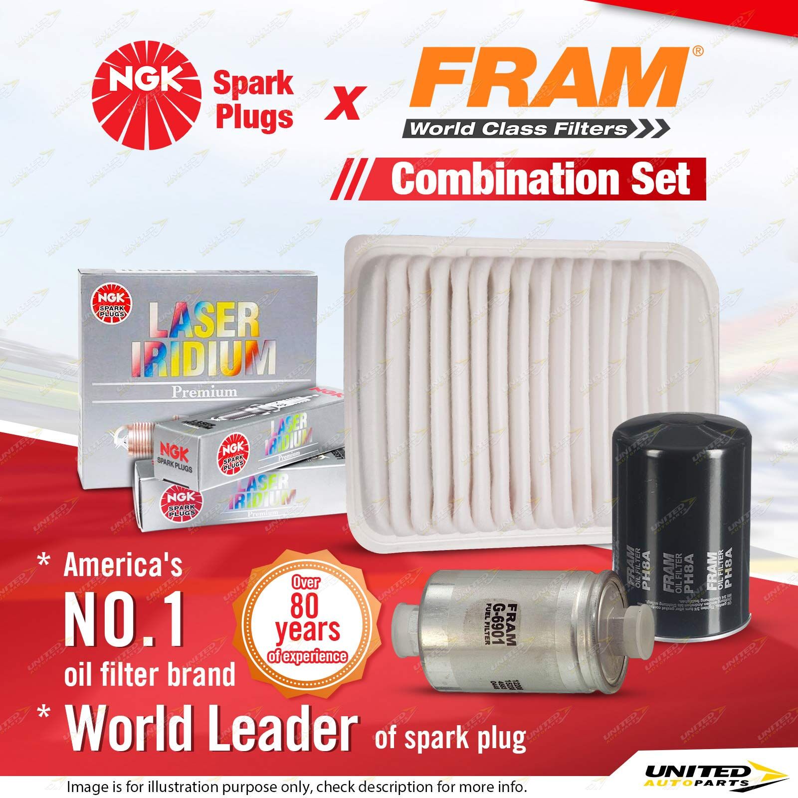 Contents : NGK Laser Iridium Spark Plugs + Fram Filter Service Kit