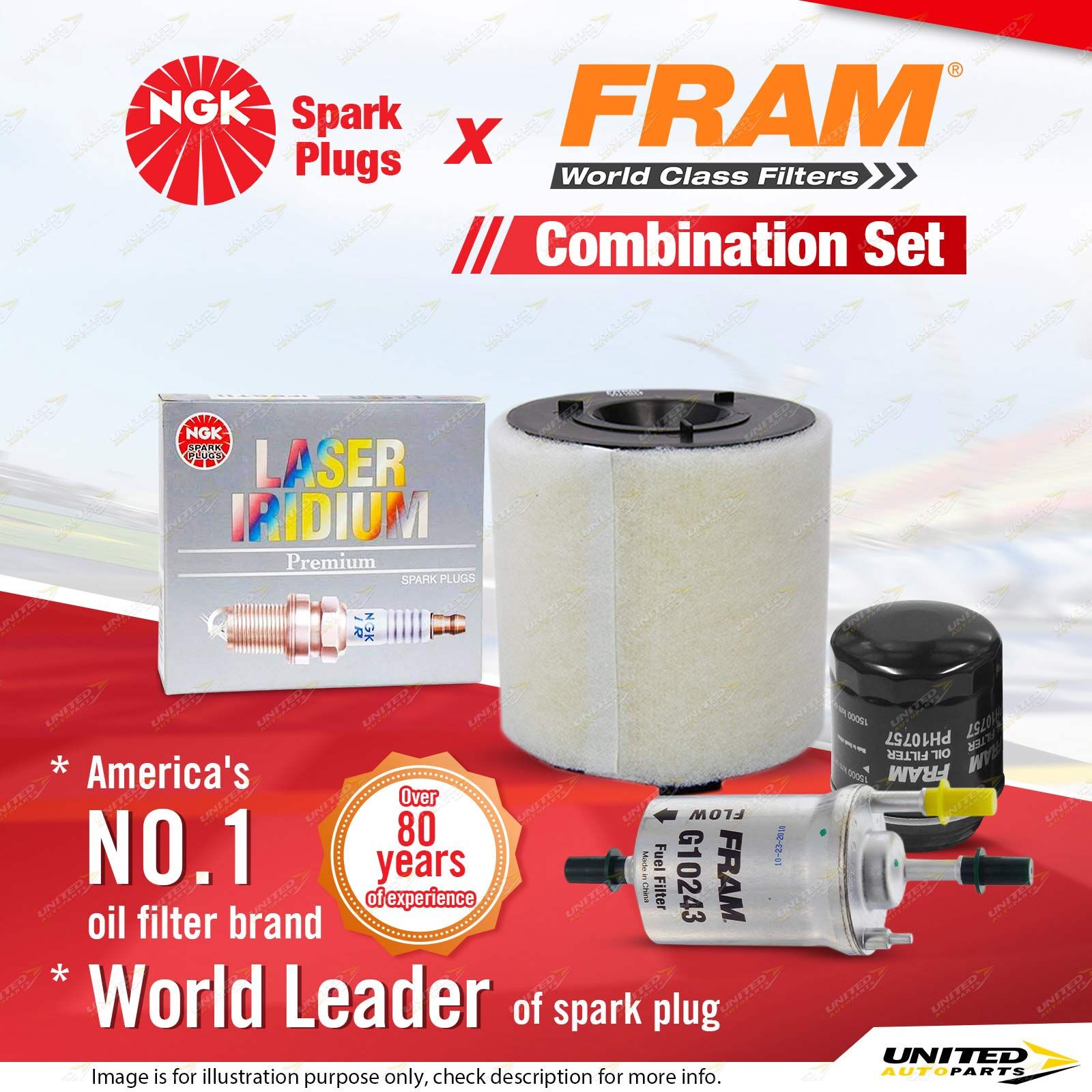 Contents : NGK Laser Iridium Spark Plugs + Fram Filter Service Kit