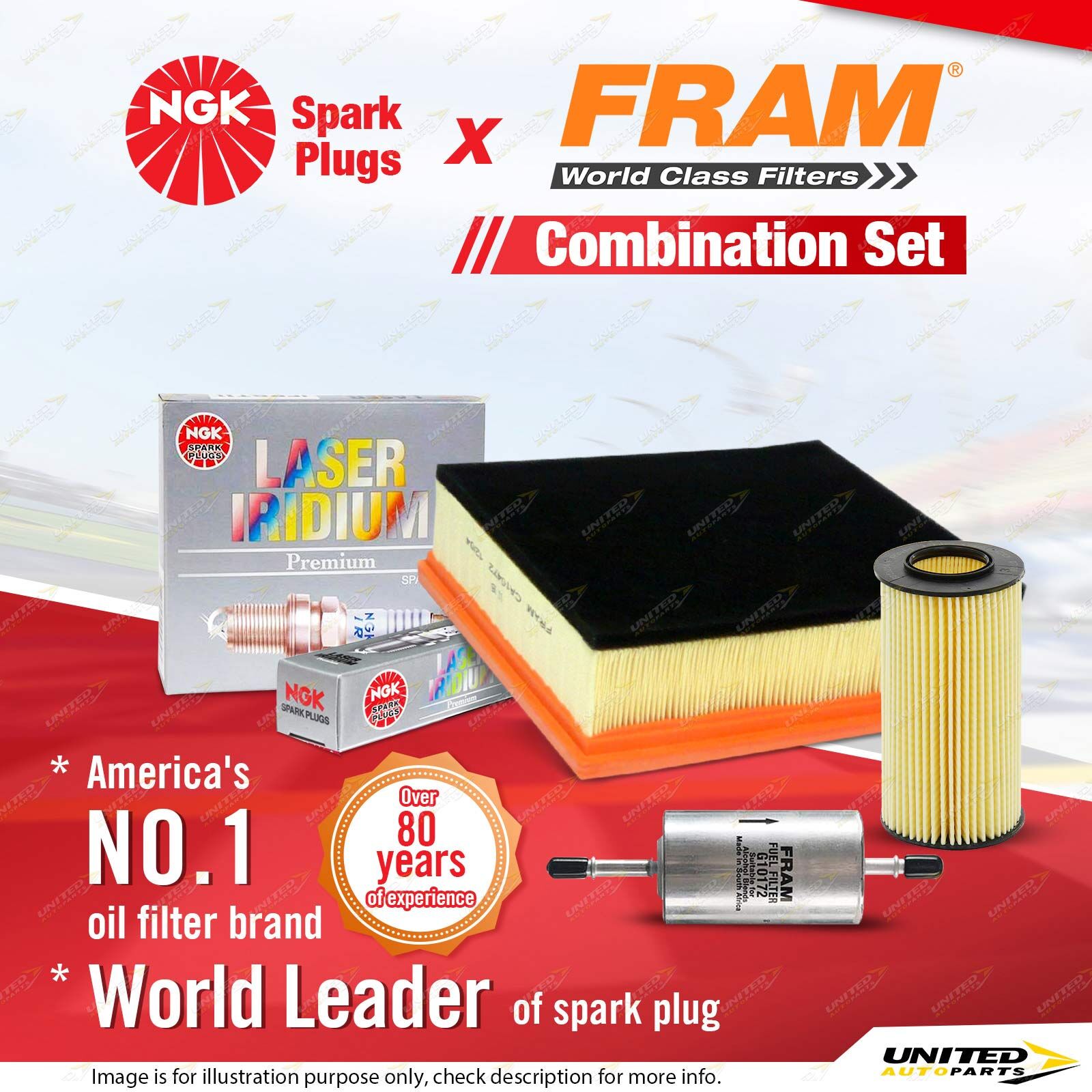 Contents : NGK Laser Iridium Spark Plugs + Fram Filter Service Kit