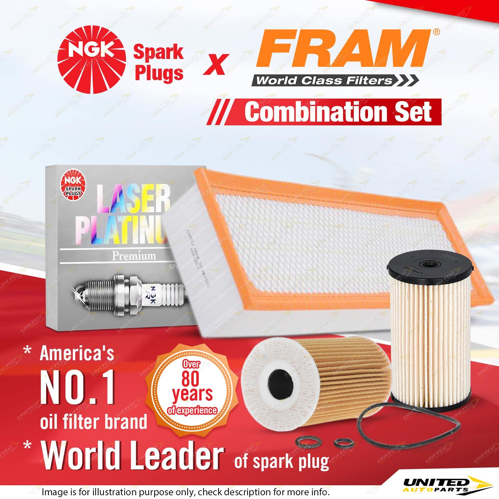 Contents : NGK Laser Platinum Spark Plugs + Fram Filter Service Kit