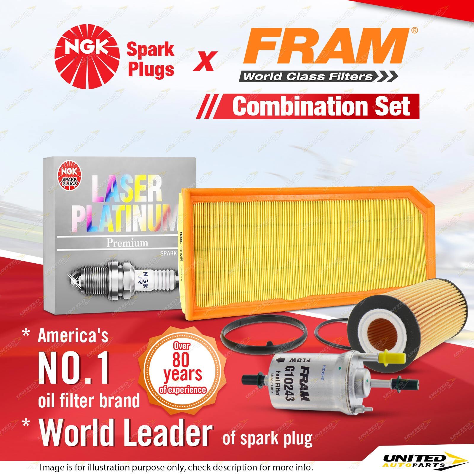 Contents : NGK Laser Platinum Spark Plugs + Fram Filter Service Kit