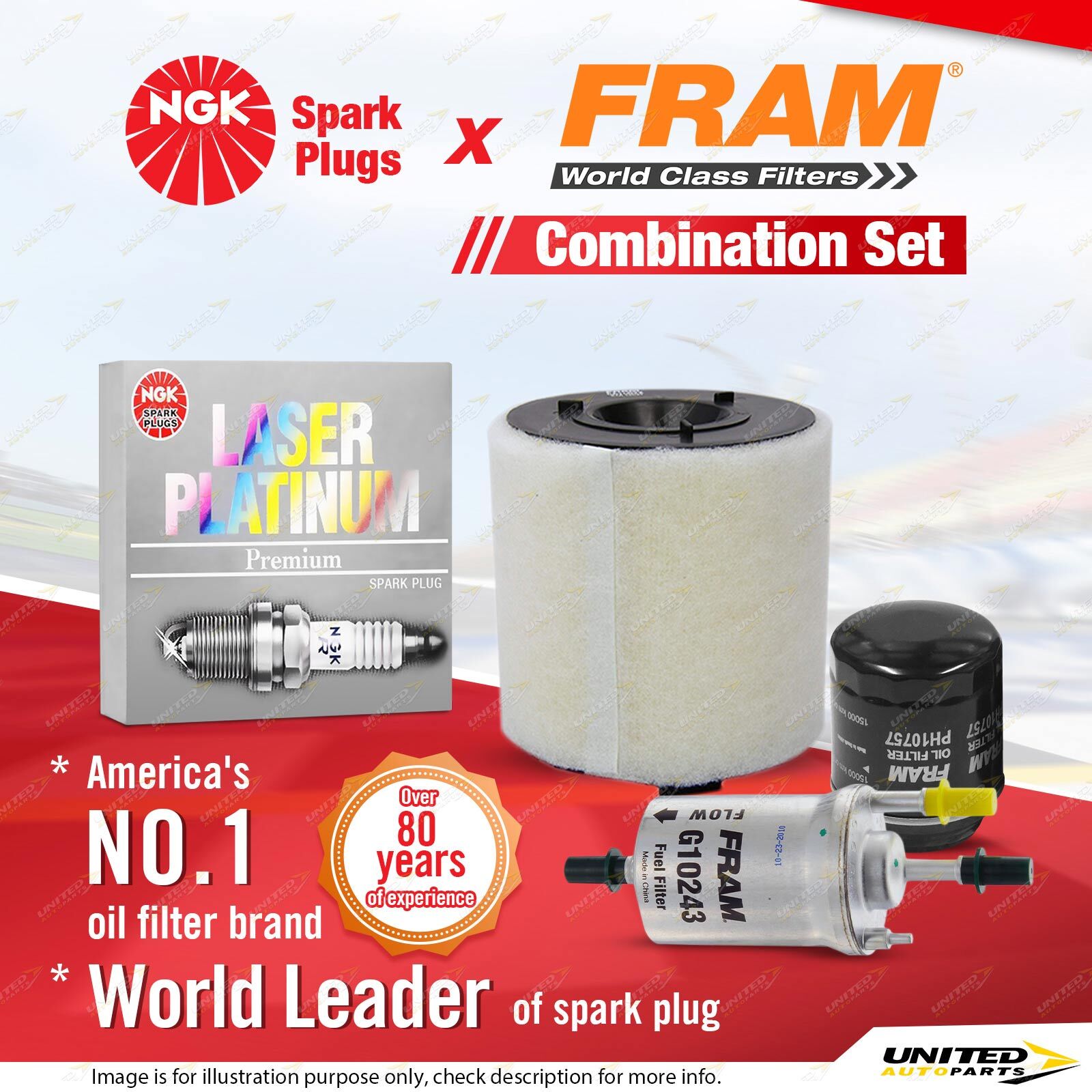 Contents : NGK Laser Platinum Spark Plugs + Fram Filter Service Kit