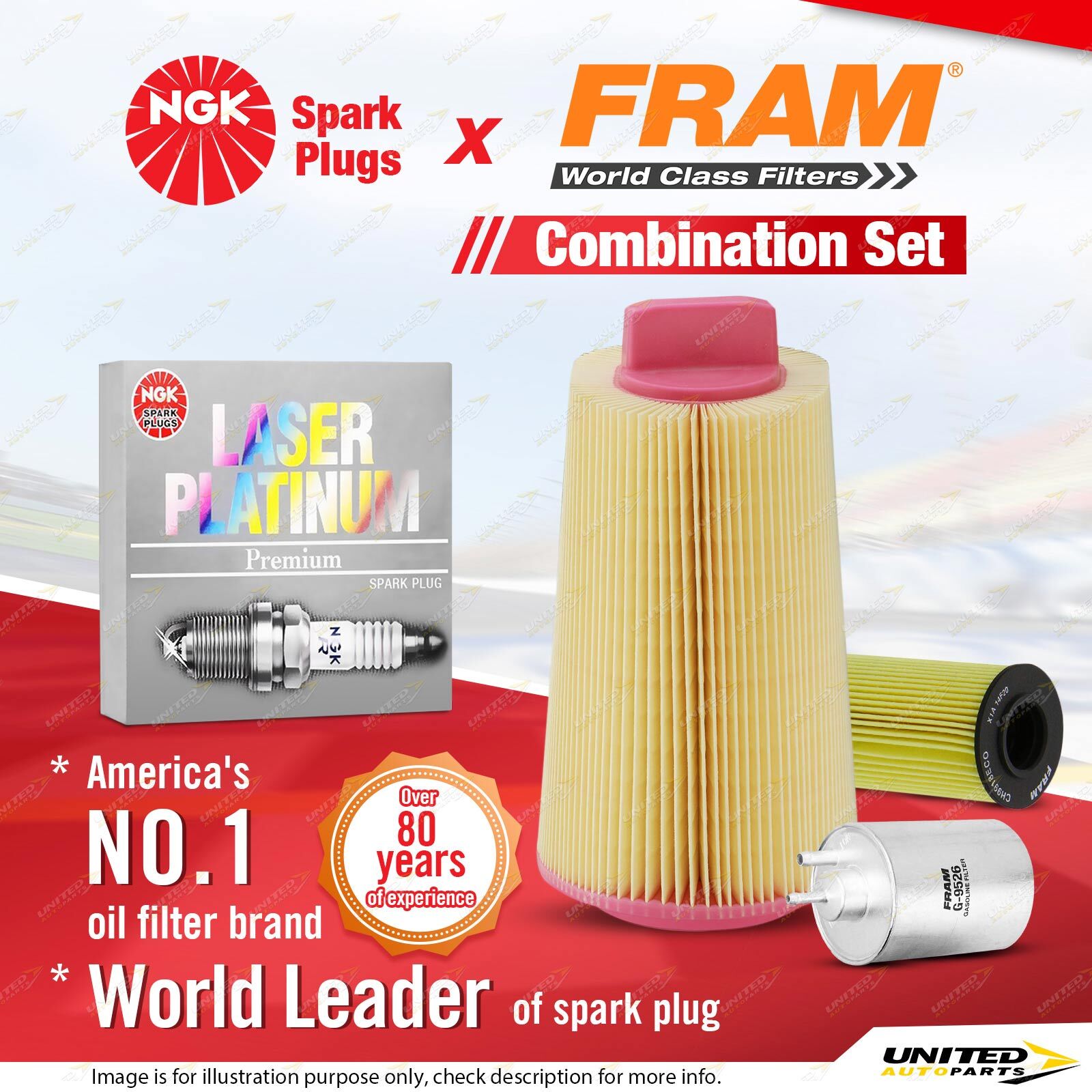 Contents : NGK Laser Platinum Spark Plugs + Fram Filter Service Kit