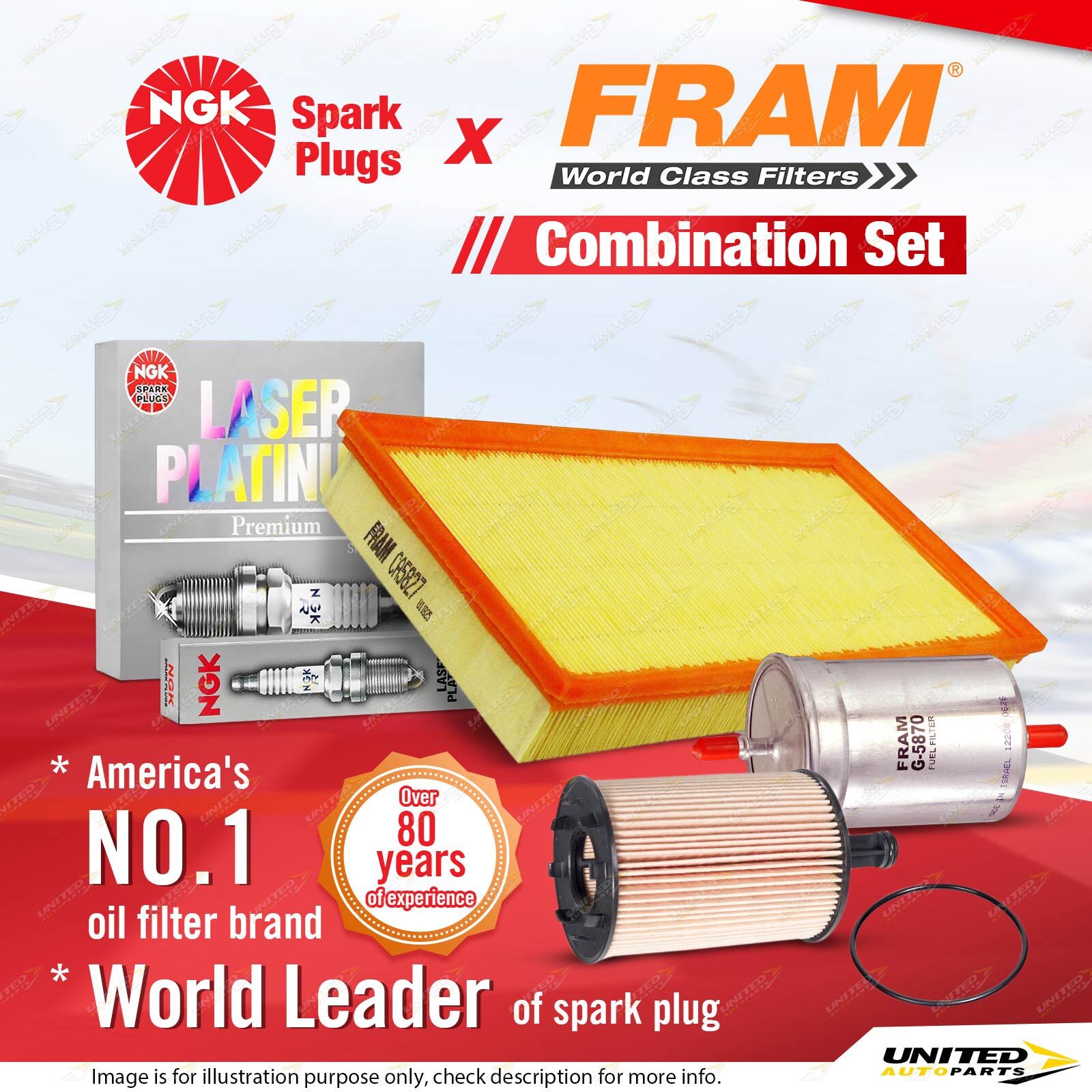 Contents : NGK Laser Platinum Spark Plugs + Fram Filter Service Kit