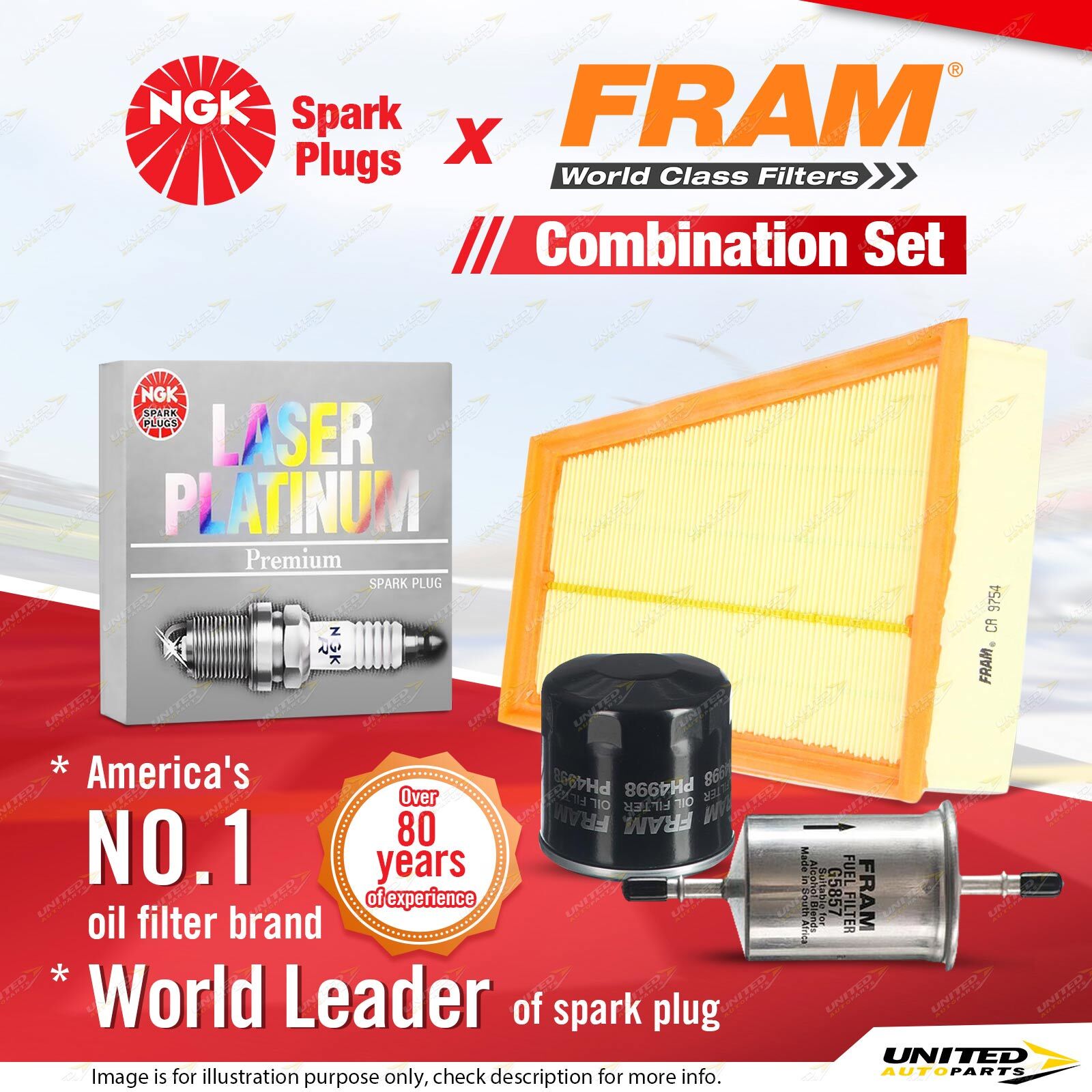 Contents : NGK Laser Platinum Spark Plugs + Fram Filter Service Kit