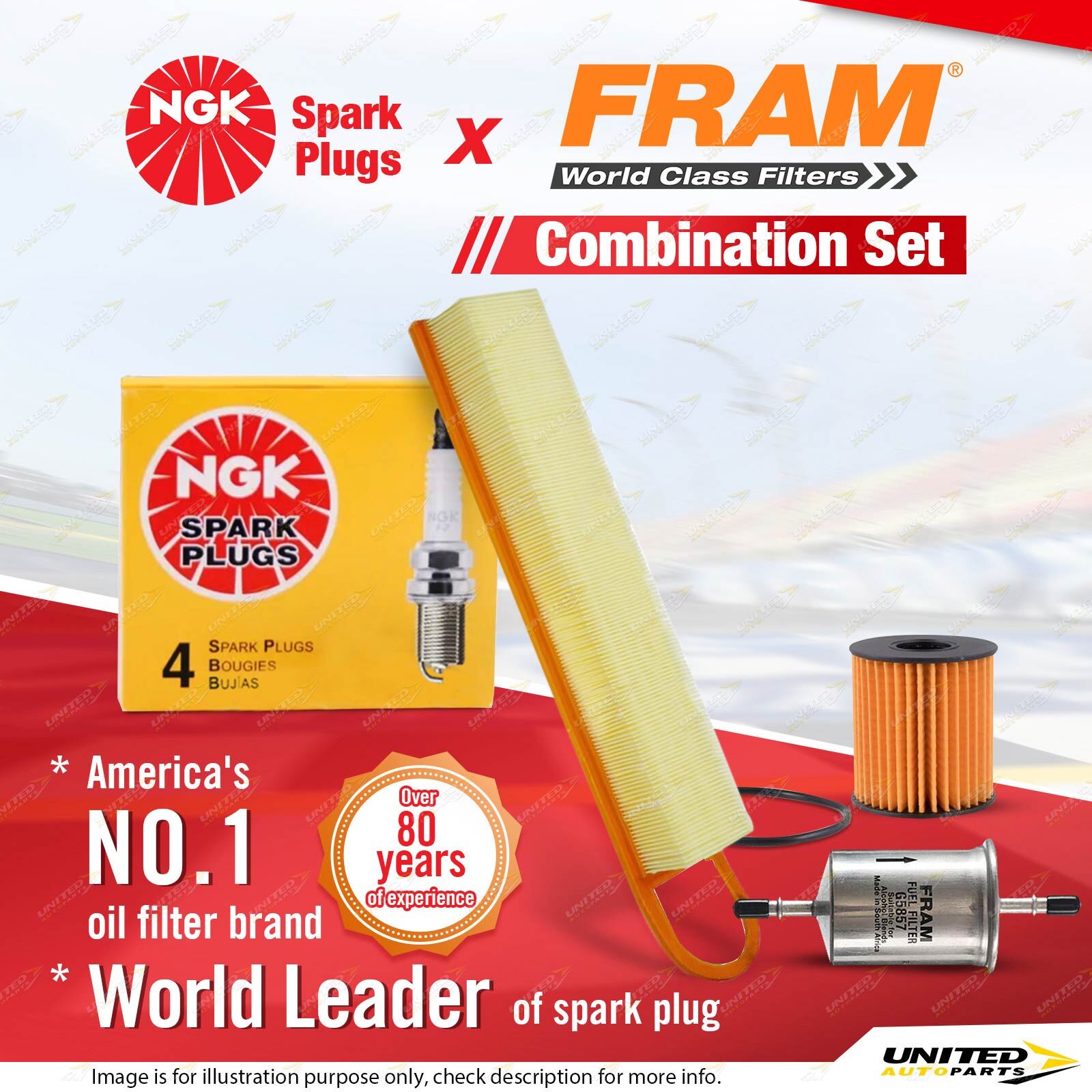 Contents : NGK Standard Spark Plugs + Fram Filter Service Kit