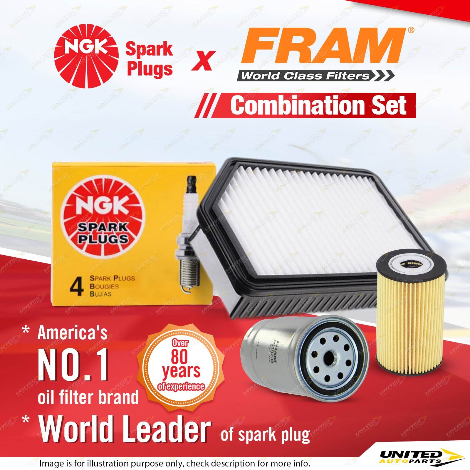 Contents : NGK Standard Spark Plugs + Fram Filter Service Kit