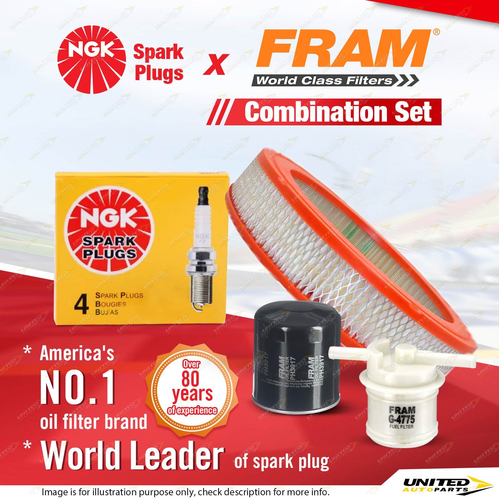 Contents : NGK Standard Spark Plugs + Fram Filter Service Kit