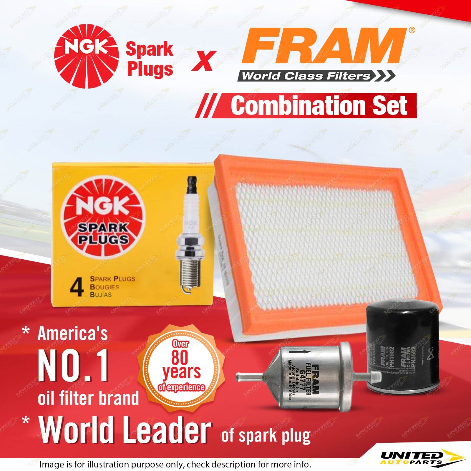 Contents : NGK Standard Spark Plugs + Fram Filter Service Kit