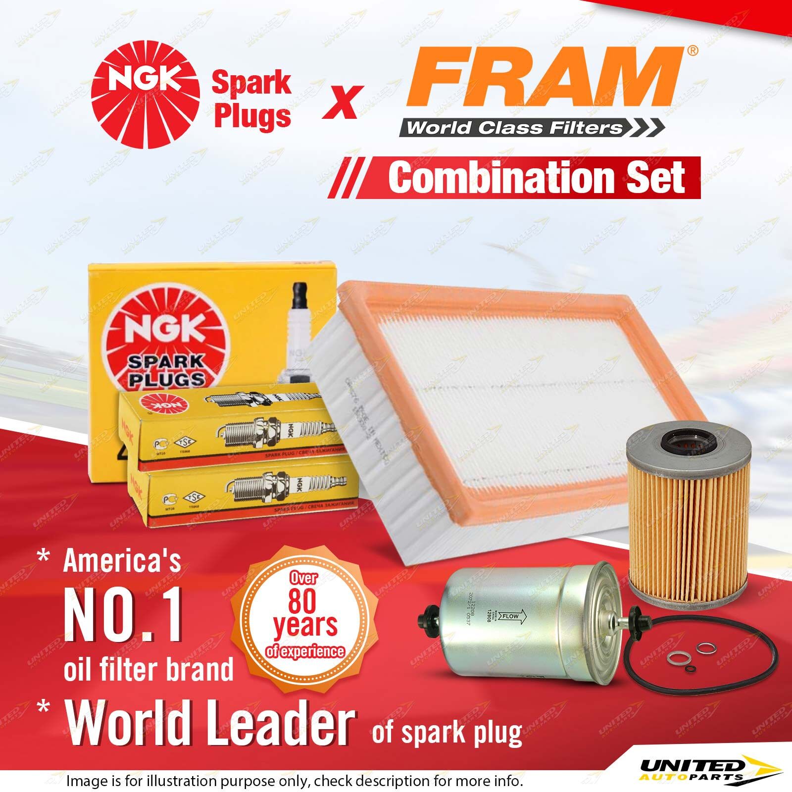 Contents : NGK Standard Spark Plugs + Fram Filter Service Kit