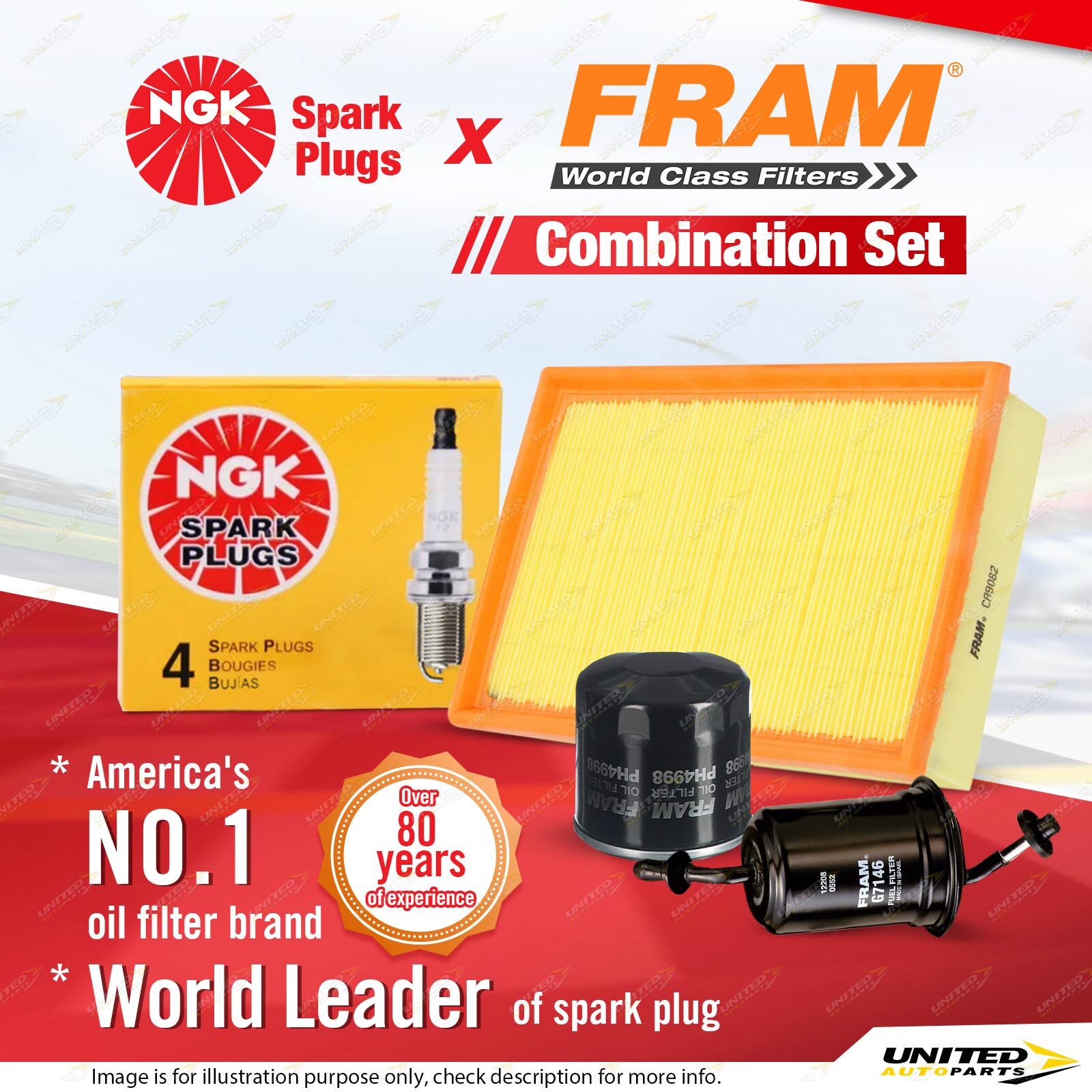 Contents : NGK Standard Spark Plugs + Fram Filter Service Kit