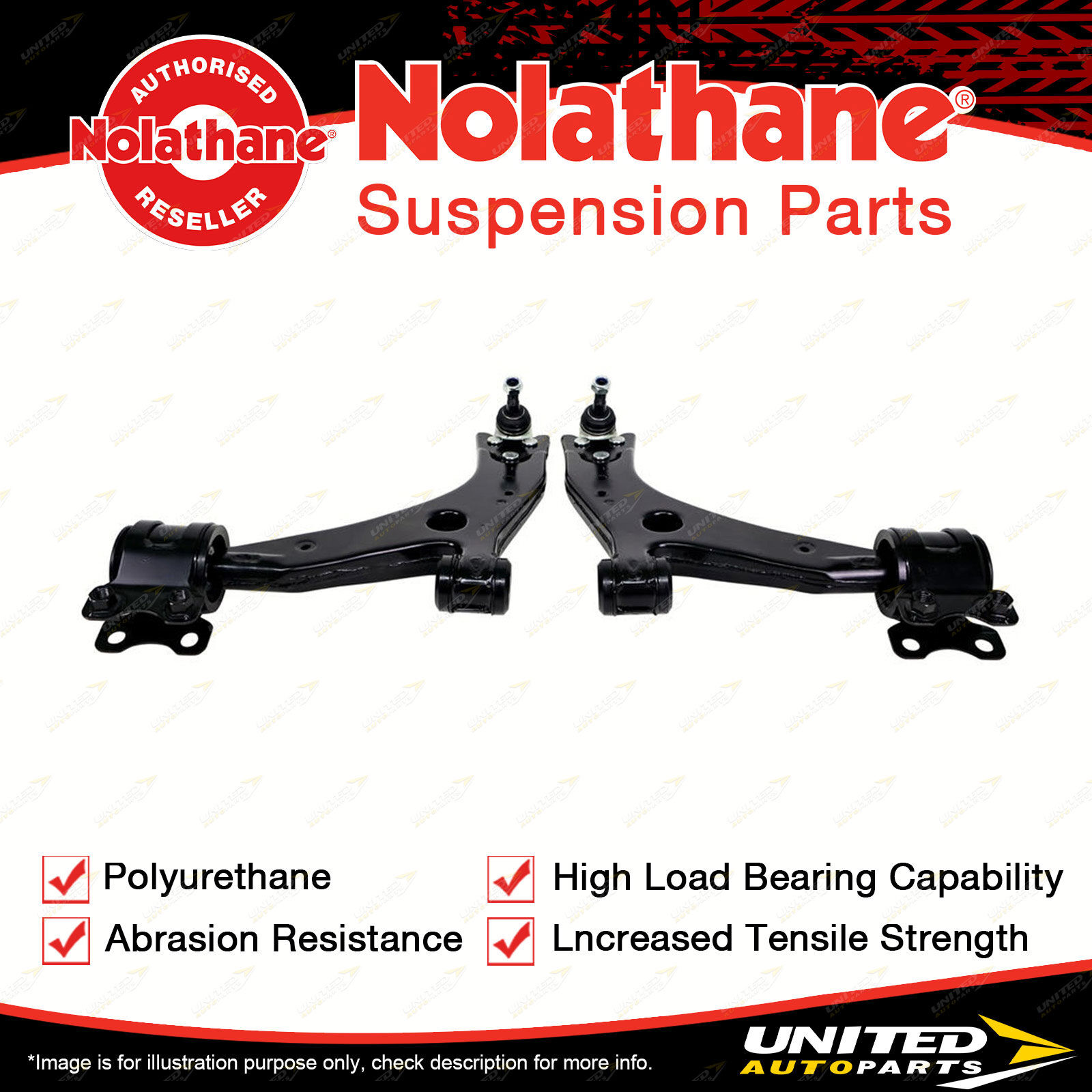 Contents : Nolathane Control Arm Lower - Arm Assembly Position : Front Warranty : 3 Year / 60,000Kms Kit Contents : 2 Arms |