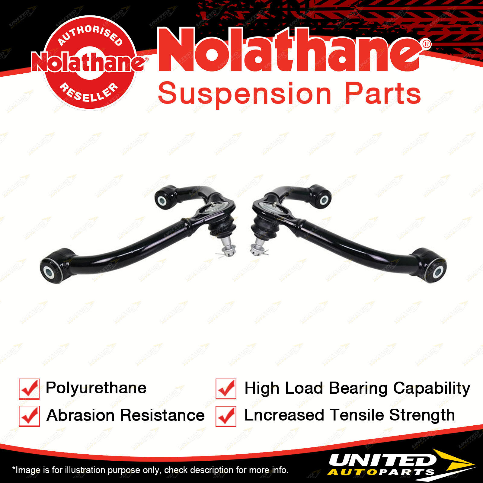 Contents : Nolathane Control Arm Upper - Arm Assembly Position : Front Warranty : Lifetime Kit Contents : 2 Arms |
