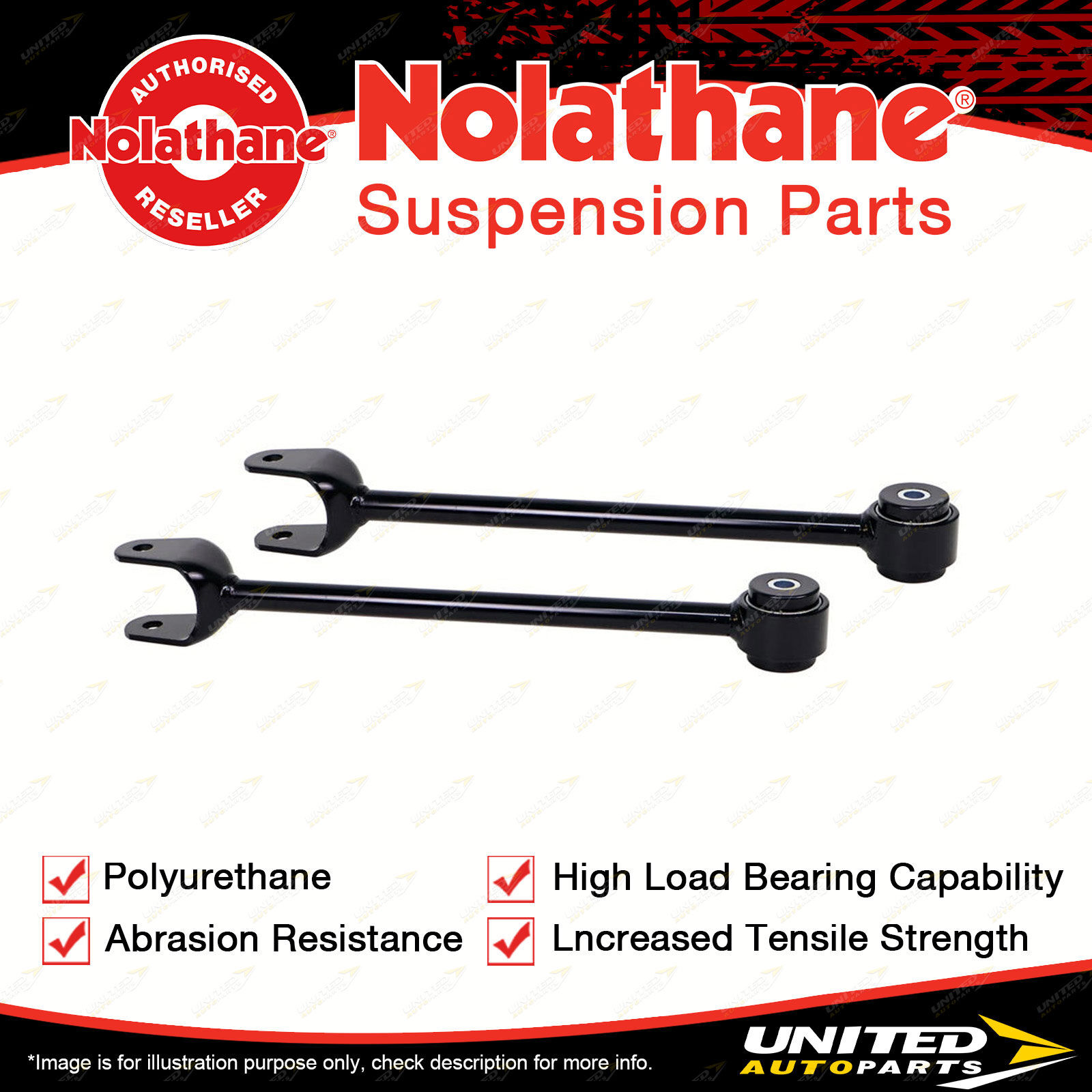Contents : Nolathane Control Arm Lower Rear - Arm Assembly Position : Rear Warranty : Lifetime Kit Contents : 2 Arms |