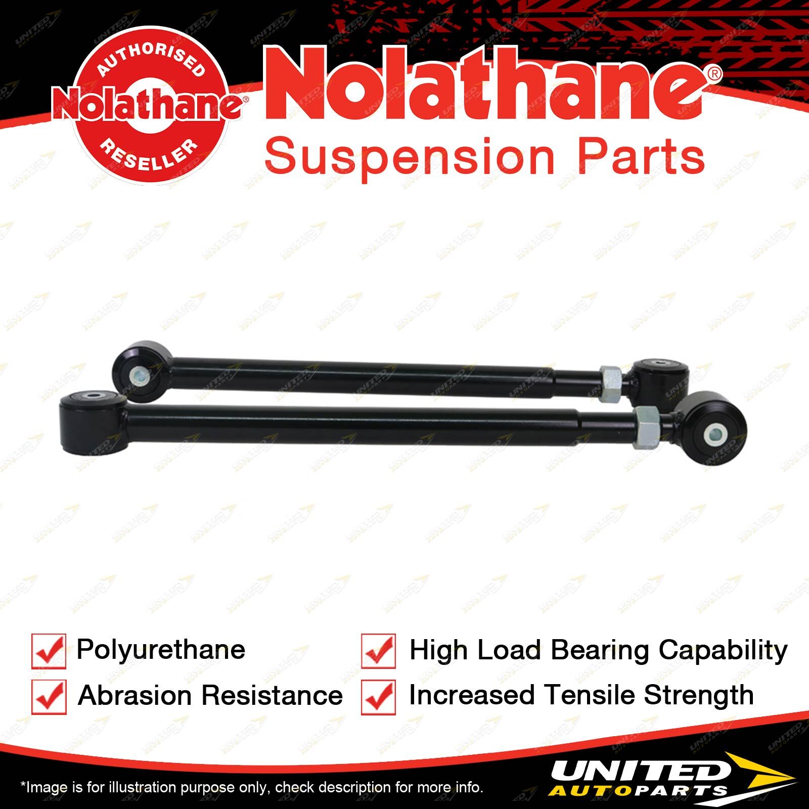 Contents : Nolathane Trailing Arm Lower - Arm Assembly Position : Rear Warranty : 3 Year / 60,000km Kit Contents : 2 Arms |
