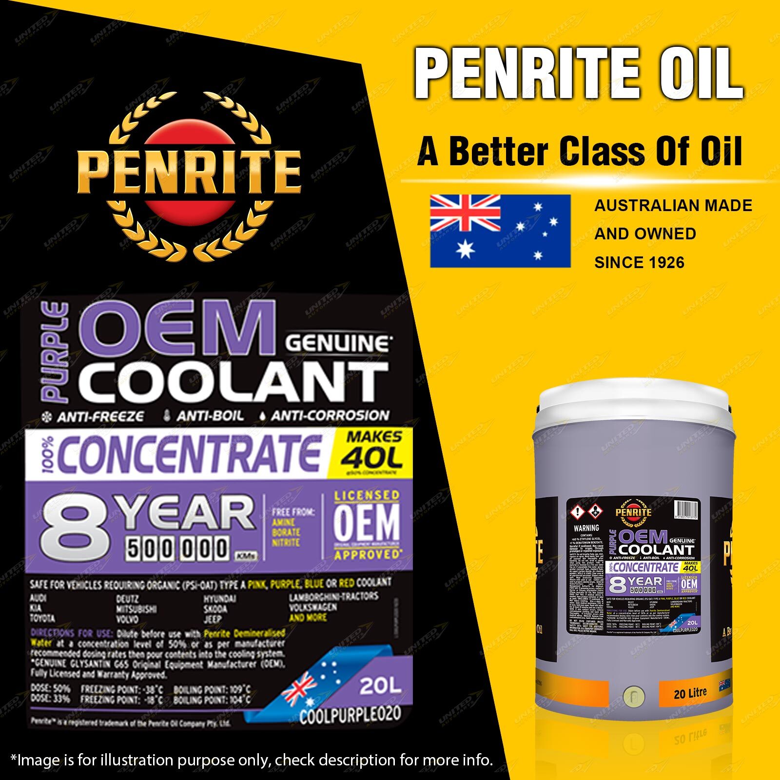Purple OEM Coolant is suitable for the cooling systems of petrol, LPG, light and heavy-duty diesel and industrial engines where anti-freeze / anti-boil and anti-corrosion properties are required. It is suitable for passenger cars, 4WD's, motorcycles, light & heavy-duty commercial vehicles, construction and agricultural equipment. It is suitable for use with Australian, European, Asian & US vehicles.