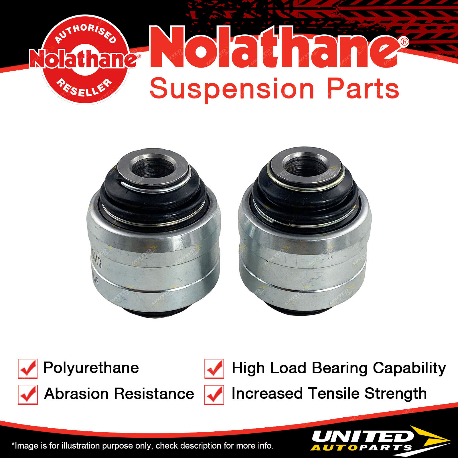 Nolathane bushing kits are covered for their lifetime. Nolathane complete control arms (excl. 45946L & 45946R), trailing arms, panhard rods, strut rods, lowering blocks, u bolts, camber bolts and sway bar links are covered by a 3 year/60,000km warranty from the date of their original installation. 45946L & 45946R are covered by a 12 month/20,000km warranty. | ![]() |