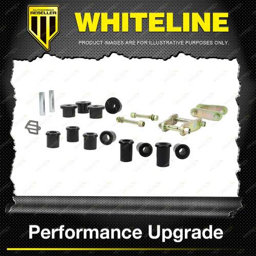 Contents : Whiteline Vehicle Essentials - Shakle Pin Bushing Kit Position : Rear Warranty : 3 Year / 60,000KMS Kit Contents : 2 Shackles, 2 Pins, 12 Bushings, 2 Tubes, grease |